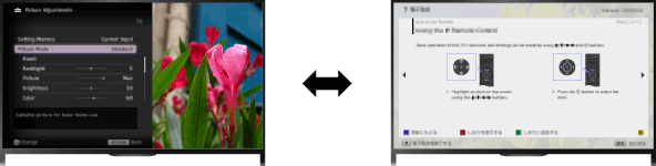 Tekan tombol i-MANUAL berulang kali untuk beralih antar layar TV dan halaman i-Manual yang sebelumnya ditampilkan. Dengan begitu, Anda bisa melihat i-Manual saat mengoperasikan TV.