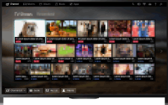 - Anda dapat melihat thumbnail siaran langsung dan siaran mendatang serta kontek yang direkam. Pilih sub kategori yang diinginkan untuk mengubah sumber. Anda juga bisa mengubah sistem siaran dengan menggunakan [Daftar Saluran] di bagian bawah Menu Beranda.