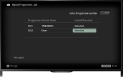 button in [PIN Code], enter the password, then select [Digital Programme Block] or [Analogue Programme Block] → the programme to be blocked → [Blocked].