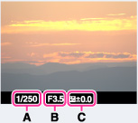 Shutter speed of 0.4 seconds or longer is indicated by [”], for example, 0.4”.