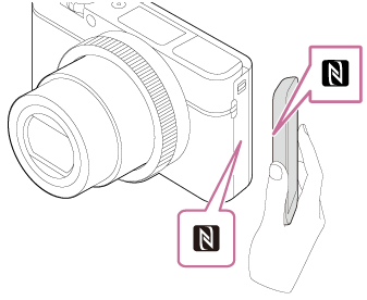 (N mark) is displayed on the product. - Touch the smartphone to the product for 1-2 seconds until PlayMemories Mobile launches.
