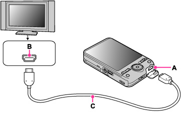 اتصال دهنده HDMI دوربین (A) و اتصال HDMI تلویزیون (B) را با استفاده از یک کابل HDMI (فروش جداگانه) (C) به یکدیگر وصل کنید.