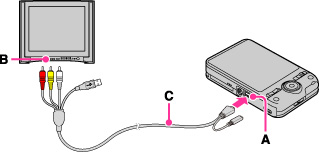 اتصال دهنده چندگانه دوربین (A) و اتصال های ورودی صوتی/تصویری روی تلویزیون (B) را با استفاده از یک کابل USB/AV/DC IN برای ترمینال چندمنظوره (فروش جداگانه) (C) به یکدیگر وصل کنید.