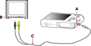 - Connect the USB / A/V OUT terminal (A) and audio/video input jacks on the TV (B) using the dedicated A/V cable VMC-15CSR1 (sold separately) (C).