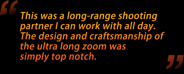 With the lens mounted onto the ‘action-focused’ Sony α9 camera, the mirrorless setup felt well-balanced and light, unlike an equivalent DSLR solution. This was a long-range shooting partner I can work with all day. The design and craftsmanship of the ultra long zoom was simply top notch. The focusing ring and zoom ring were both smooth and responsive to touch, so recomposing my shot at different focal lengths proved effortless. Contributing to its excellent handling, the AF/MF, AF distance limiter and AF hold switches were all placed within easy reach, making it a productive tool for the sports photographer. The ability to rotate the polarizing filter via a hatch on the hood is a nice touch, helping to save time in the field.