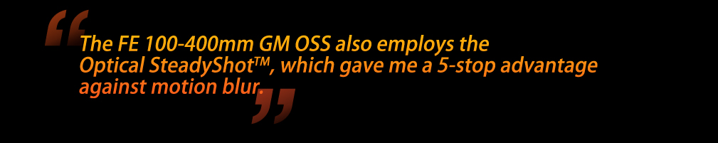 The Sony FE 100-400mm GM OSS is an all-new lens design employing 22 elements in 16 groups - including one Super ED (Extra-Low Dispersion) and two ED lenses. It also features a nine-blade iris system with maximum and minimum apertures of f4.5 and f22 at 100mm, or f5.6 and f40 at 400mm. With such high quality glass and aperture system, it boded well for the images that I was about to capture that blistering afternoon.