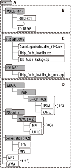 *1 Even if a file is transferred directly under the VOICE folder, it will not be displayed on the