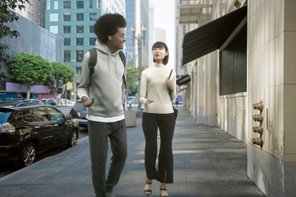 LinkBuds provide enhanced capabilities integrated with Microsoft Soundscape.[vii] Their open-ear shape enables users to hear audio beacons and callouts of buildings or intersections, with the natural sound of surroundings. Compass/gyro sensors inside the headphone can detect the direction of your head and allow you to hear the sound from a destination, without holding your smartphone[viii].